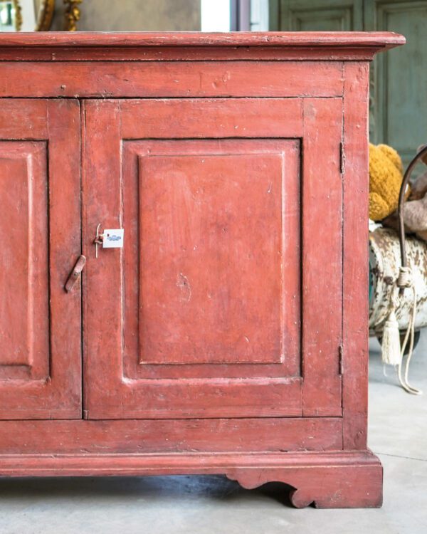 Credenza realizzata in legno antico di prima patina ad integrazione di due sportellini antichi in abete che andavano a chiudere una nicchia murale. La patinatura è stata realizzata di un colore rosso non troppo acceso su base gesso che ne determina la corposità favorendo la realizzazione di una patina molto vissuta percepibile sia al tatto che alla vista. La laccatura è stata realizzata seguendo le originali tecniche artigianali del ‘700. Tutti questi procedimenti fanno sì che l’oggetto somigli in tutto e per tutto ad un esemplare di quel periodo.