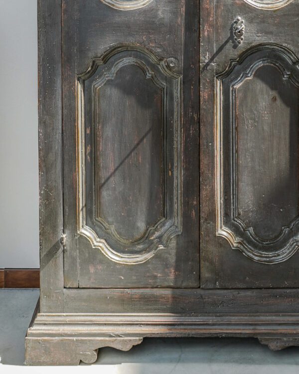 Armadio realizzato con le ante di una porta marchigiana del ‘700 con laccatura originale del periodo sui toni del marrone. Dopo un leggero restauro conservativo delle ante è stata realizzata tutta la struttura dell’armadio rispettando i canoni stilistici del periodo riscontrabili nei movimenti delle cornici. Cappello e ciabatta sono stati realizzati con legno antico di prima patina e laccati secondo le tecniche artigianali della prima metà del ‘700 per ottenere un prodotto molto simile agli originali antichi senza presentare elementi artificiosi.